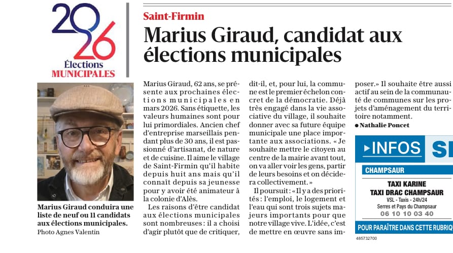 Article paru dans le Dauphiné Libéré • décembre 2025 Marius Giraud et son équipe annoncent leur candidature aux municipales de Saint-Firmin !